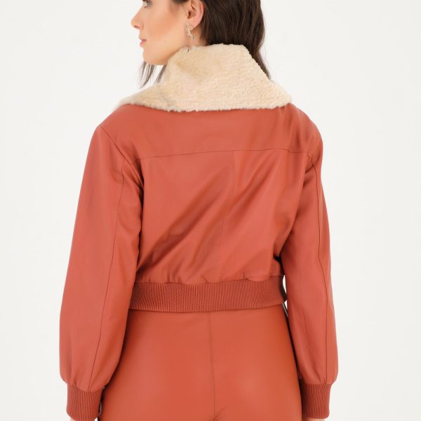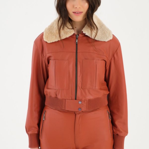 Bermuda em couro chamois com pregas e bolsos frontais. Fechamento por botão de pressão.